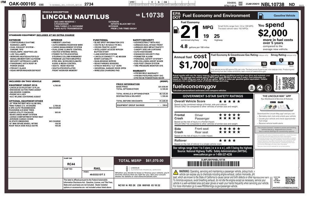 Cargo Utility Package (110V/150W AC Power Outlet, Cargo Compartment w/Reversible Mat, Interior Cargo Cover, Molded Plastic Storage Bins, and Rear Cargo Management System), Equipment Group 201A (Phone As A Key and Wheels: 20 Prem Painted Bright Machined Aluminum), Lincoln Co-Pilot360 1.0 Plus Package (360 Degree Camera w/Rear Camera Wash, Active Park Assist 2.0, Adaptive Cruise Control, Distance Indication & Alert, Evasive Steering Assist, and Forward-Side-Rear Parking Sensors), Lincoln Signature Certification Certified, 3.80 Axle Ratio, Rain sensing wipers, Rear window wiper, Speed-Sensitive Wipers, Variably intermittent wipers, 10 Speakers, 4-Wheel Disc Brakes, ABS brakes, Air Conditioning, Alexa Built-In, Alloy wheels, AM/FM radio: SiriusXM with 360L, Auto High-beam Headlights, Auto tilt-away steering wheel, Auto-dimming door mirrors, Auto-dimming Rear-View mirror, Automatic temperature control, Brake assist, Bumpers: body-color, Compass, Cruise Control / Speed control, Delay-off headlights, Driver door bin, Driver vanity mirror, Dual front impact airbags, Dual front side impact airbags, Electronic Stability Control, Emergency communication system: 911 Assist, Four wheel independent suspension, Front anti-roll bar, Front Bucket Seats, Front Center Armrest w/Storage, Front dual zone A/C, Front reading lights, Fully automatic headlights, Garage door transmitter: HomeLink, Heated door mirrors, Heated front seats, Heated rear seats, Heated steering wheel, Illuminated entry, Knee airbag, Leather steering wheel, Low tire pressure warning, Memory seat, Navigation System, Occupant sensing airbag, Outside temperature display, Overhead airbag, Overhead console, Panic alarm, Passenger door bin, Passenger vanity mirror, Power door mirrors, Power driver seat, Power Liftgate, Power moonroof: Panoramic Vista Roof, Power passenger seat, Power steering, Power windows, Prem Lthr-Trimmed Heated/Ventilated Captain Seats, Radio data system, Radio: AM/FM/HD Audio System, Rear anti-roll bar, Rear reading lights, Rear seat center armrest, Rear window defroster, Remote keyless entry, Satin Roof Rack Side Rails w/o Crossbars, Security System, Speed-sensing steering, Split folding rear seat, Spoiler, Steering wheel memory, Steering wheel mounted A/C controls, Steering wheel mounted audio controls, SYNC 4 w/Enhanced Voice Recognition, Tachometer, Telescoping steering wheel, Tilt steering wheel, Traction control, Trip computer, Turn signal indicator mirrors, and Ventilated front seats