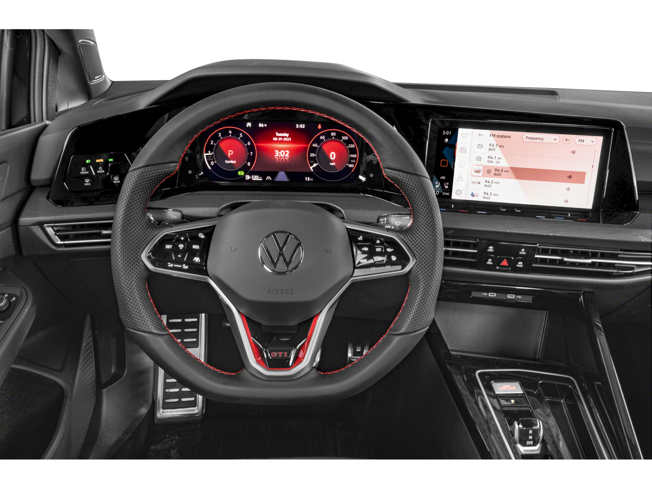 2023 Volkswagen Golf GTI Black Autobahn 4-Wheel Disc Brakes, 9 Speakers, ABS brakes, Active Blind Spot Monitor, Adaptive suspension, Air Conditioning, Alloy wheels, AM/FM radio: SiriusXM with 360L, Auto High-beam Headlights, Auto-dimming Rear-View mirror, Automatic temperature control, Brake assist, Bumpers: body-color, Compass, Delay-off headlights, Driver door bin, Driver vanity mirror, Dual front impact airbags, Dual front side impact airbags, Electronic Stability Control, Emergency communication system: VW Car-Net Safe & Secure 5-year, Exterior Parking Camera Rear, Forward collision: FCW w/Autonomous Emergency Braking mitigation, Four wheel independent suspension, Front anti-roll bar, Front Bucket Seats, Front Center Armrest, Front dual zone A/C, Front fog lights, Front reading lights, Fully automatic headlights, harman/kardon® Speakers, Heads-Up Display, Heated & Ventilated Front Top Sport Seats, Heated door mirrors, Heated front seats, Heated rear seats, Heated steering wheel, Illuminated entry, Leather steering wheel, Low tire pressure warning, Memory seat, Navigation System, Occupant sensing airbag, Outside temperature display, Overhead airbag, Overhead console, Panic alarm, Passenger door bin, Passenger vanity mirror, Perforated Vienna Leather Seating Surfaces, Power door mirrors, Power driver seat, Power moonroof: Panoramic, Power passenger seat, Power steering, Power windows, Radio data system, Radio: MIB3 Discover Pro w/10 Touchscreen Navi, Rain sensing wipers, Rear air conditioning, Rear anti-roll bar, Rear reading lights, Rear seat center armrest, Rear window defroster, Rear window wiper, Remote keyless entry, Security system, Speed control, Speed-sensing steering, Speed-Sensitive Wipers, Split folding rear seat, Spoiler, Sport steering wheel, Steering wheel mounted audio controls, Tachometer, Telescoping steering wheel, Tilt steering wheel, Traction control, Trip computer, Turn signal indicator mirrors, Variably intermittent wipers, Ventilated front seats, Wheels: 19 2-Tone Diamond-Turned Alloy. Clean CARFAX. FWD 7-Speed DSG Automatic with Tiptronic 2.0L TSI DOHC